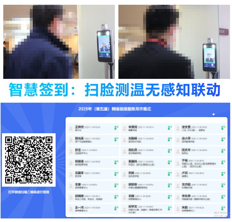 智慧签到试点报告厅:作为试点应用,探索门禁、测温、人脸识别、场馆预约和会议签到等系统的集成互联,完成快速无感知会议签到等人员密集场景智慧防控应用。目前,已初步完成“e会宝+场馆预约平台+智能热成像体温检测系统+健康宝”四系统间的集成互联,实现线上会议与场馆联动预约、无感知体温测量、单人无感知人脸识别签到的一体化“智慧签到”功能。