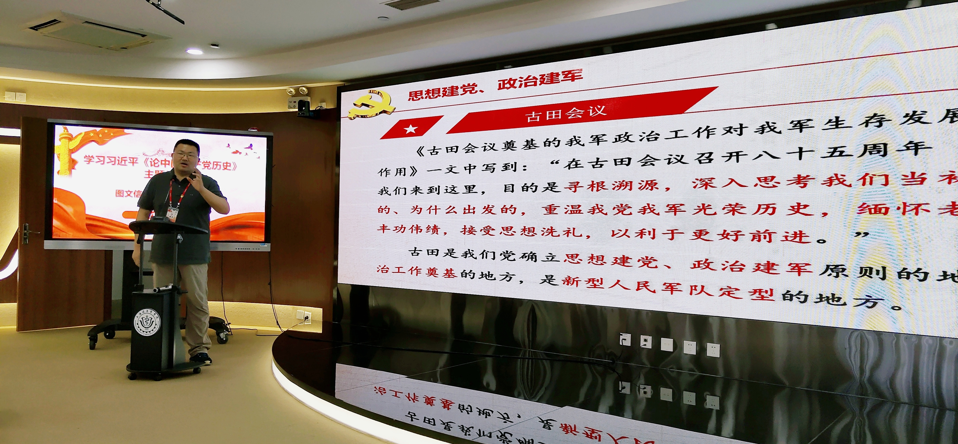 谭老师首先对总书记《论中国共产党历史》文集做了简明介绍:这部专题文集收入总书记2012年11月29日至2020年11月12日期间关于中国共产党历史的重要文稿40篇。接着结合自己学习党史的心得着重讲解我党于1929年12月28-29日在福建省上杭县古田村召开的“古田会议”。