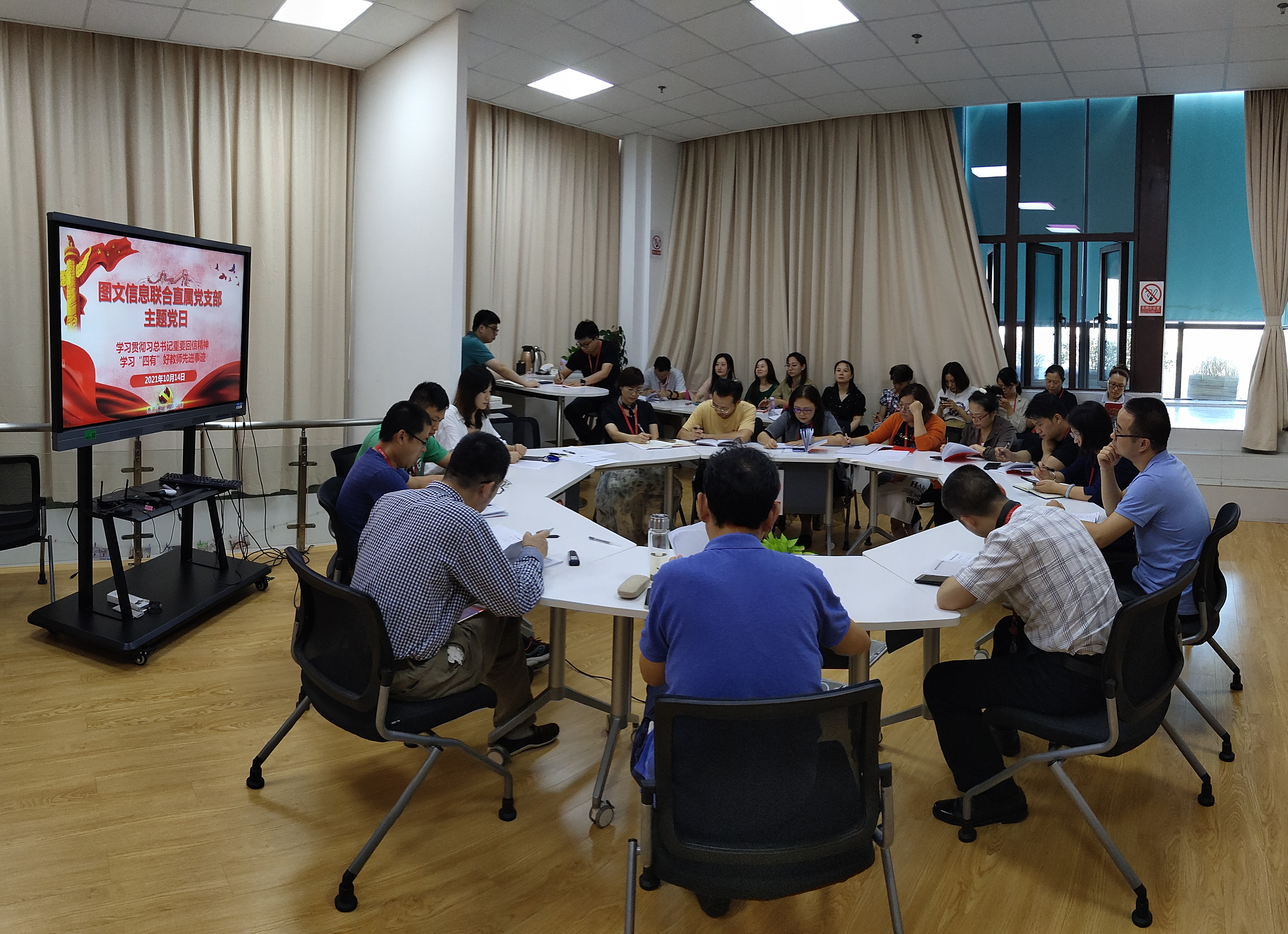 10月14日下午15:30,图文信息联合直属党支部全体党员在南苑3号楼5楼信管中心会议室进行专题学习交流。本次学习的主要内容包括:一、党委教师工作部下发的相关文件;二、“四有”好老师先进事迹;三、习近平总书记重要回信精神。