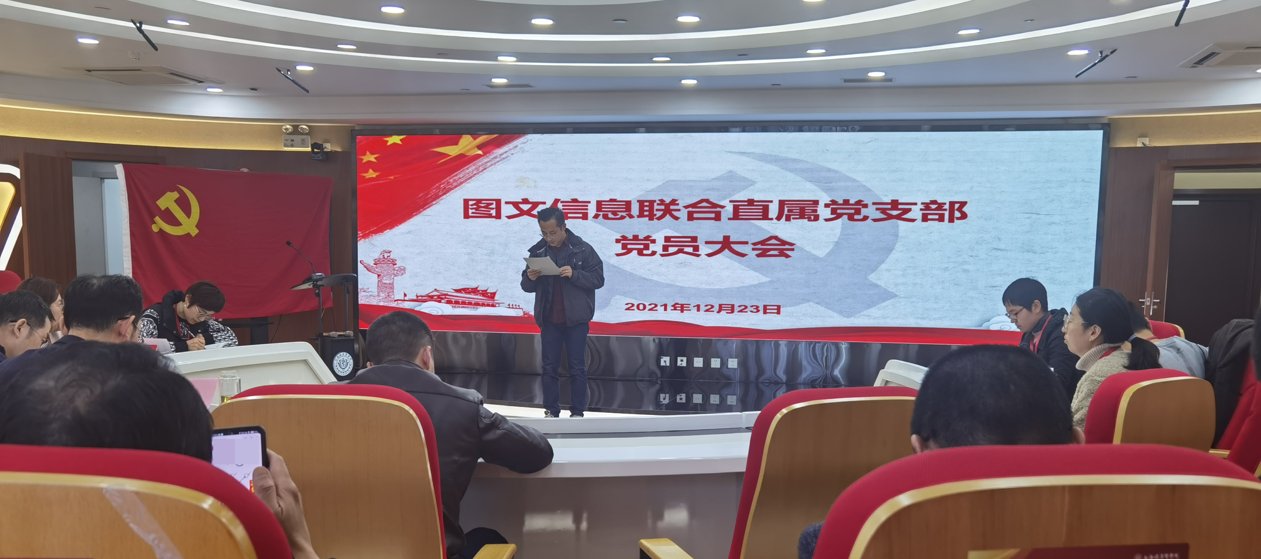 图文信息联合直属党支部于2021年12月23日下午14:00在南苑三号楼五楼图书馆报告厅召开预备党员郝辰业同志的转正大会。会议由支部书记王云光书记主持,支部全体党员、预备党员和发展对象共28人与会。