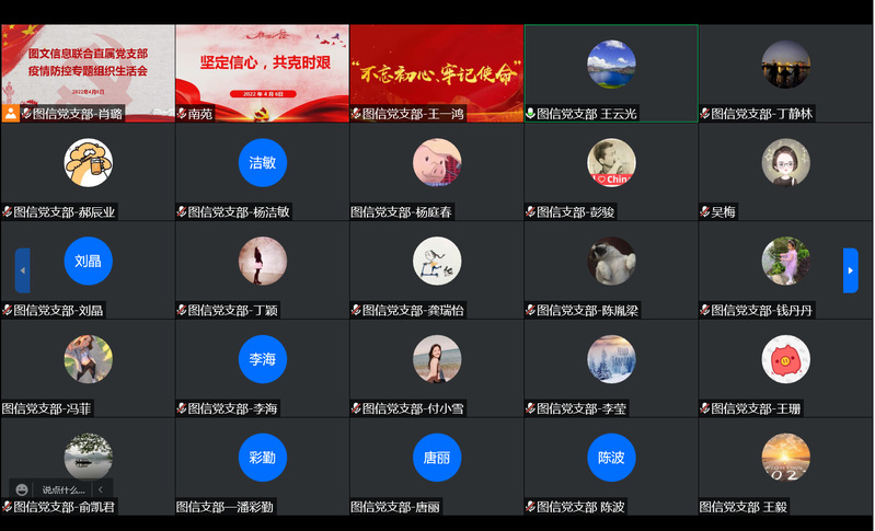 目前,上海市疫情防控已经到了最紧要的关头,根据学校党委相关要求,图文信息联合直属党支部积极响应,于2022年4月6日召开线上疫情防控专题组织生活会,坚决落实党中央、教育部、上海市关于疫情防控工作再动员、再部署、再落实的精神和要求,支部全体成员拧成一股绳,同心同力做好疫情防控这件最头等大事。会议由党支部书记王云光主持,支部全体党员及发展对象参加。